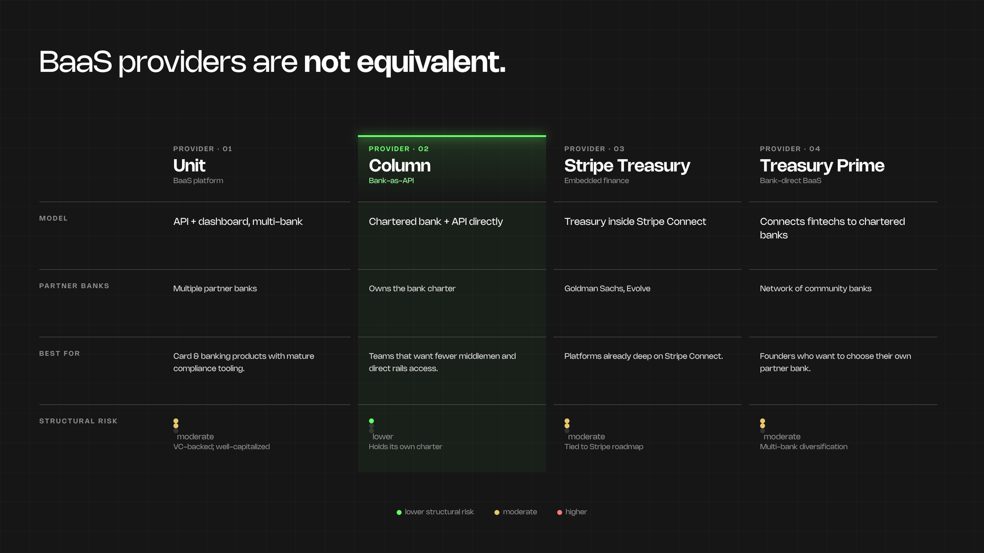 Banking-as-a-Service providers — Unit, Column, Stripe Treasury, Treasury Prime, and others — are not equivalent. They differ in risk appetite, partner bank relationships, supported use cases, pricing, and frankly, survival probability. Some are profitable businesses with long bank relationships. Some are venture-backed startups burning toward their next raise. Synapse had $51 million in VC funding and a16z's endorsement. It still filed for Chapter 11.
