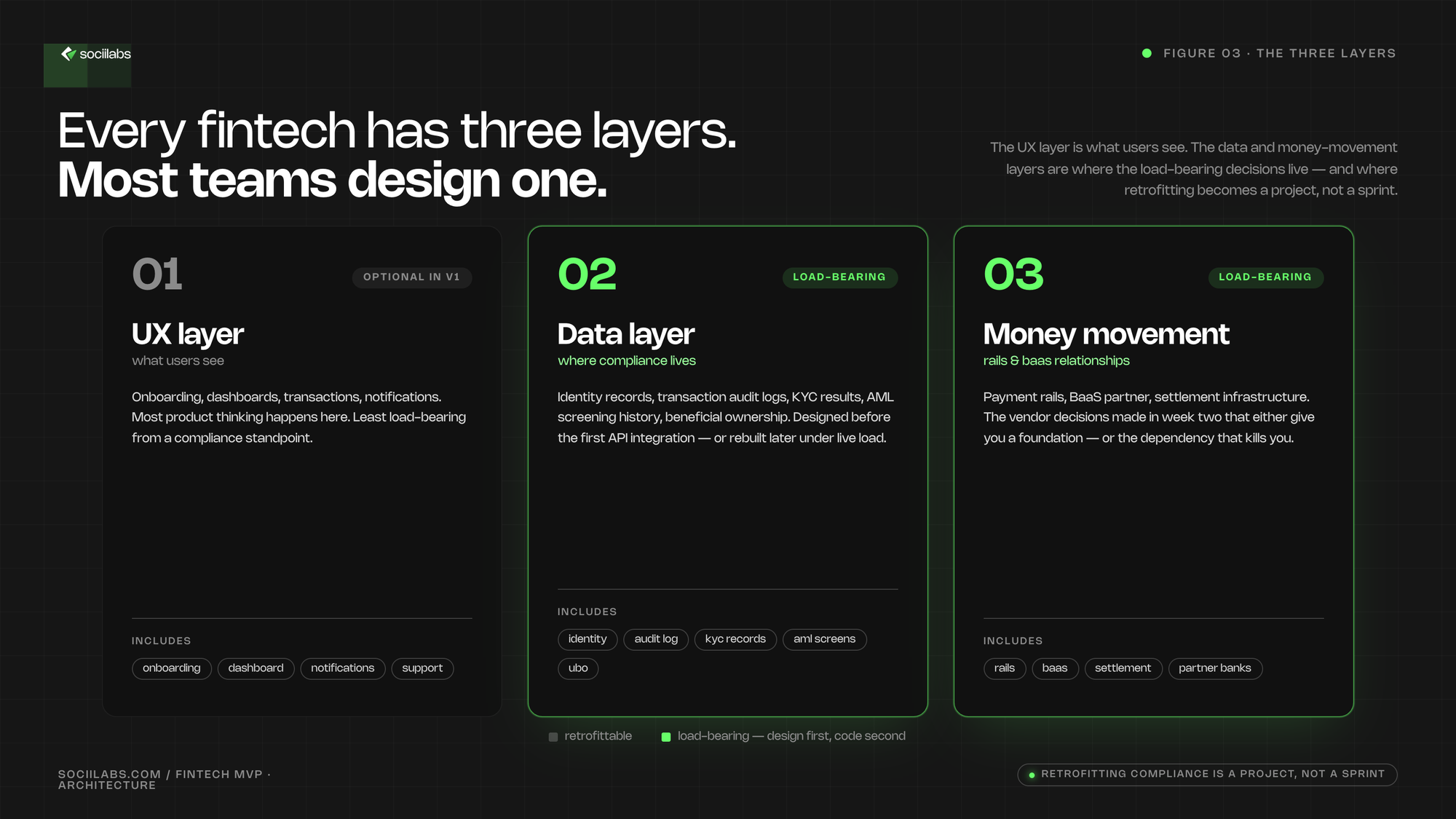 The data layer is where your compliance obligations live: identity records, transaction audit logs, KYC verification results, AML screening history, beneficial ownership data. This layer needs to be designed before you write a single API integration. Once you've built your data model without compliance requirements in mind, retrofitting it isn't a sprint. It's a project that runs alongside your live product.