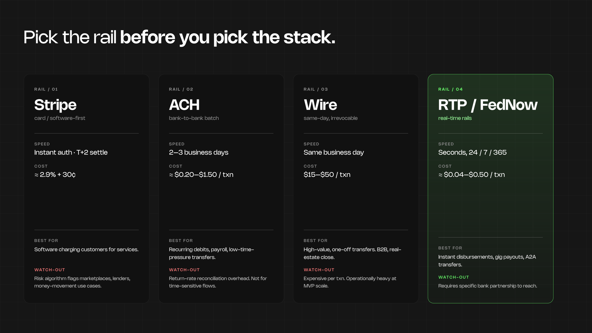The payment rail decision affects your unit economics, your user experience, your fraud exposure, and which licenses you'll need to operate. It's not a technical detail you can revisit in sprint 6.